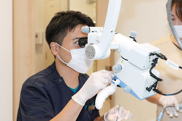 根管治療の成功率を高めるために、歯科用マイクロスコープを積極的に使用しています。マイクロスコープは、肉眼では見えない歯の根管内を約20倍まで拡大して見ることができる顕微鏡で、複雑な形状や根管内の汚れ、そして破折や穿孔(根に空いた穴)などの異変も見逃しません。再発や悪化の可能性を早期に発見できるため、より確実な治療につながります。当院では、自費診療だけでなく、保険診療においてもこのマイクロスコープを使用し、患者さまの大切な歯を守るための治療に力を入れています。