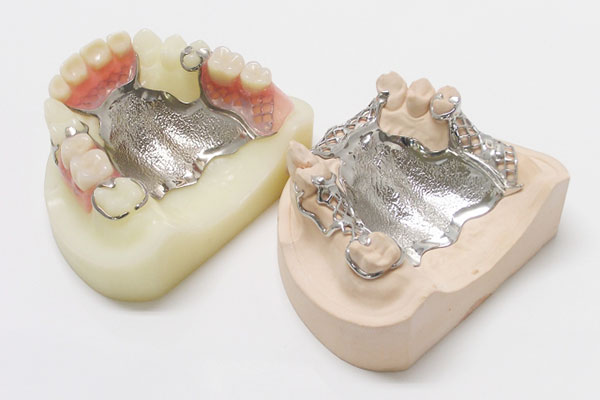 保険の入れ歯はプラスチック製ですが、金属床義歯は、入れ歯の主要部分に金属を使用します。プラスチックに比べて強度があるため、薄く作製することができ、装着した際の違和感が少ないのが特徴です。また、金属は熱が伝わりやすいため、温かい食べ物や冷たい食べ物の温度をより感じやすくなります。特にコバルトクロムやチタンといった素材は、生体親和性にも優れており、身体への負担が少ない素材です。