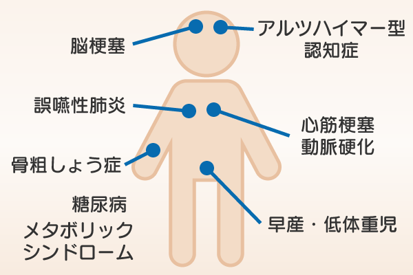 歯周病は、お口の中だけの病気ではありません。歯周病菌が血液を介して全身に運ばれることで、さまざまな病気を引き起こす、あるいは悪化させることがわかっています。例えば、糖尿病の方は歯周病が悪化しやすく、また歯周病治療を行うと糖尿病も改善しやすいという関係性があります。その他にも、脳梗塞や心筋梗塞などの循環器系疾患や、誤って口腔内の細菌を気管に吸い込むことで起こる誤嚥性肺炎、さらにはアルツハイマー型認知症、骨粗しょう症、妊娠中の女性では、早産や低体重児出産のリスクを高めるなど、多くの全身疾患と密接に関係していることが明らかになっています。
